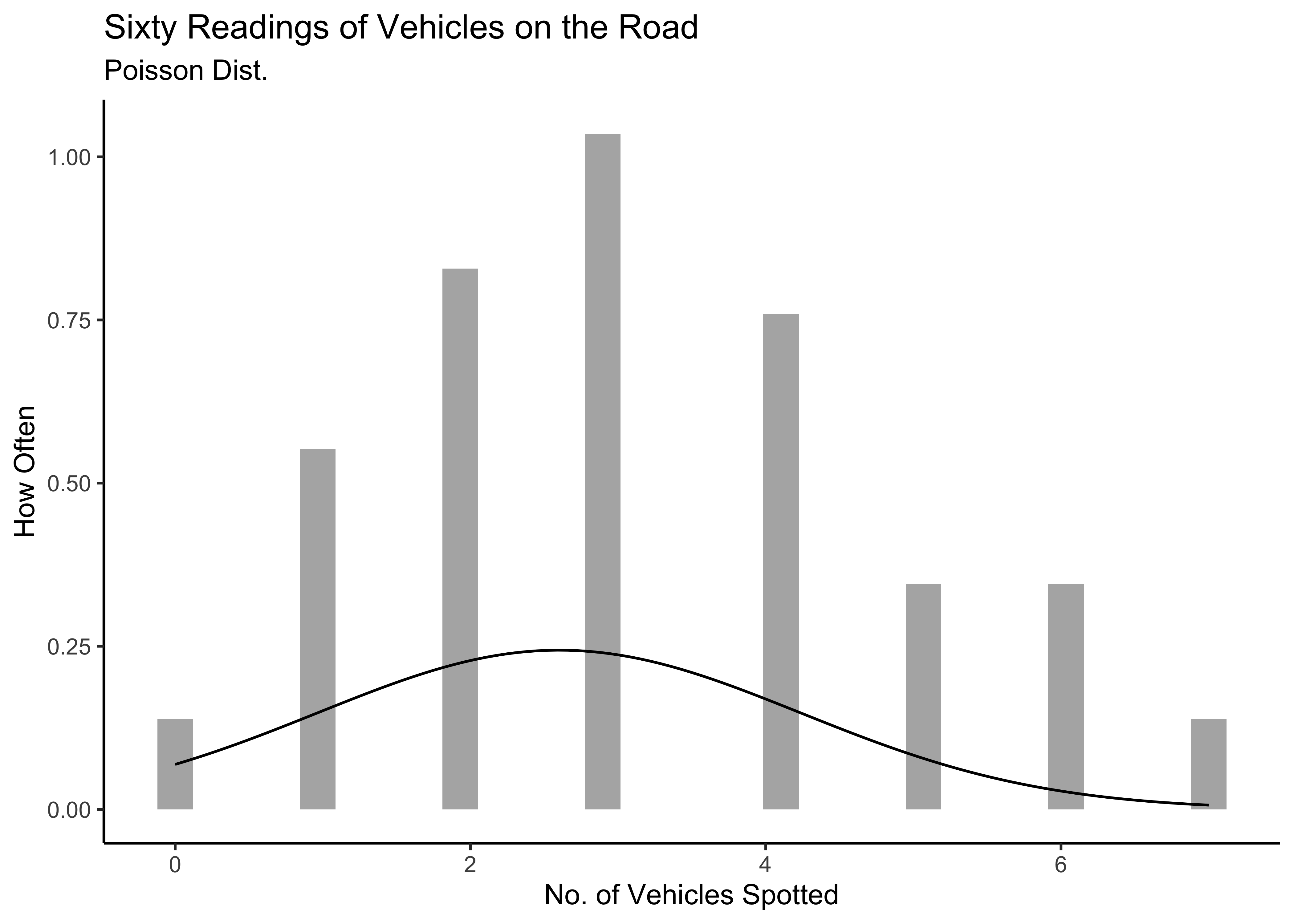 (Say) Lambda(\(\lambda\)) is the average number of cars that pass per unit of time, letās say 60/hour (\(\lambda\) = 60). We know, however, that the actual number will vary - some days more, some days less. The Poisson Distribution allows us to model this variability.